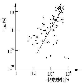 在對(duì)已運(yùn)行過的XLPE電纜進(jìn)行加速老化試驗(yàn),得出水樹枝發(fā)生的個(gè)數(shù)以及最長(zhǎng)的水樹枝長(zhǎng)度與電纜tan 測(cè)量值的關(guān)系,如圖1-8及圖1-9所示,它們的趨勢(shì)是明確的,但分散性很大。如將最長(zhǎng)的水樹枝長(zhǎng)度與每單位長(zhǎng)度電纜中的樹枝數(shù)的乘積作為橫坐標(biāo),則與測(cè)得的tanδ(縱坐標(biāo))之間具有更好的相關(guān)性,說明測(cè)得的tanδ值取決于整體損耗的變化。